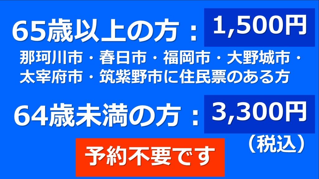 令和7年10月1日から令和8年3月31日までインフルエンザワクチン接種を行います。現時点では予約不要です(予約必要時はホームページやLINE公式アカウントにてお知らせいたします)。64歳未満の方は3,300円(税込)です。那珂川市・春日市・福岡市・大野城市・太宰府市・筑紫野市に住民票のある65歳以上の方の窓口負担額は1,500円です。